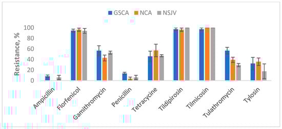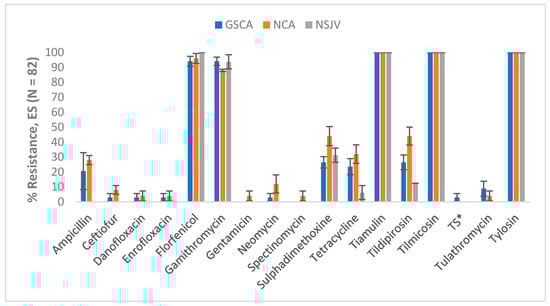 For ES isolates, regional patterns showed similar trends of high resistance to macrolides and florfenicol, with minor differences among regions (Figure 4). Ampicillin resistance was detected only in GSCA (8.1%) and NSJV (5.9%), but not in NCA samples. Penicillin resistance followed a similar pattern, being highest in GSCA (13.5%), but rare in NCA (3.6%) and NSJV (5.9%). Moderate levels of tetracycline resistance were observed across regions, ranging from 45.9% in GSCA to 57.1% in NCA. Resistance to tulathromycin was highest in GSCA (56.8%), followed by NCA (39.3%), and lowest in NSJV (29.4%). Gamithromycin resistance varied between 42.9% and 56.8% across regions, without a clear trend. In contrast, florfenicol resistance remained uniformly high (>94%) across all three regions, and complete resistance to tildipirosin and tilmicosin was observed in NSJV and NCA, and nearly complete resistance also in GSCA.