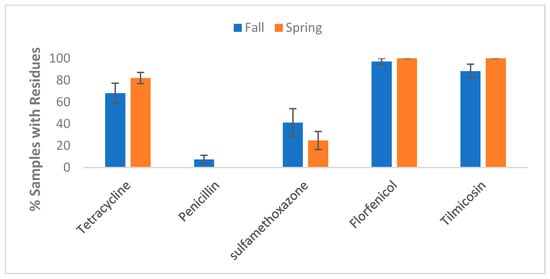 Seasonality: Seasonal differences were observed in the presence of AMD residues in lagoon water samples (Figure 5). Compared with Fall/Winter, a greater proportion of samples collected in the Spring/Summer contained florfenicol (100% vs. 97.1%), tilmicosin (100% vs. 88.2%), or tetracycline residues (82.0% vs. 68.1%). In comparison, fewer samples had sulfamethoxazone residues (24.7% vs. 41.2%), and none had penicillin residues.