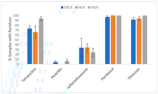 Regional variations: Regional comparisons also revealed differences in the distribution of residues (Figure 6). Tetracycline residues were most frequently detected in NSJV samples (93.9%), compared with GSCA (73.2%) and NCA (66.0%). Penicillin residues were rare overall but detected in GSCA (4.2%) and NSJV (6.1%) samples, with none found in NCA. Sulfamethoxazole residues showed comparable prevalence across GSCA (33.8%) and NCA (34.0%) but were somewhat lower in NSJV (24.2%). Florfenicol residues were nearly ubiquitous across all regions (97.2–100%), as were tilmicosin residues (91.6–100%).