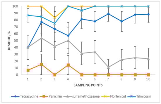 Variations across sampling time points: The variations in proportions of samples with AMD residues across the 10 different sampling points over two seasons are depicted in Figure 7. Although not statistically significant, an increasing trend was observed in tilmicosin or tetracycline residues from sampling points 1 to 10, while a decreasing trend was observed in penicillin or sulfamethoxazone residues during the same period. Florfenicol was detected at 100% at all sampling points except point 3, which had a slight deduction to 85%.