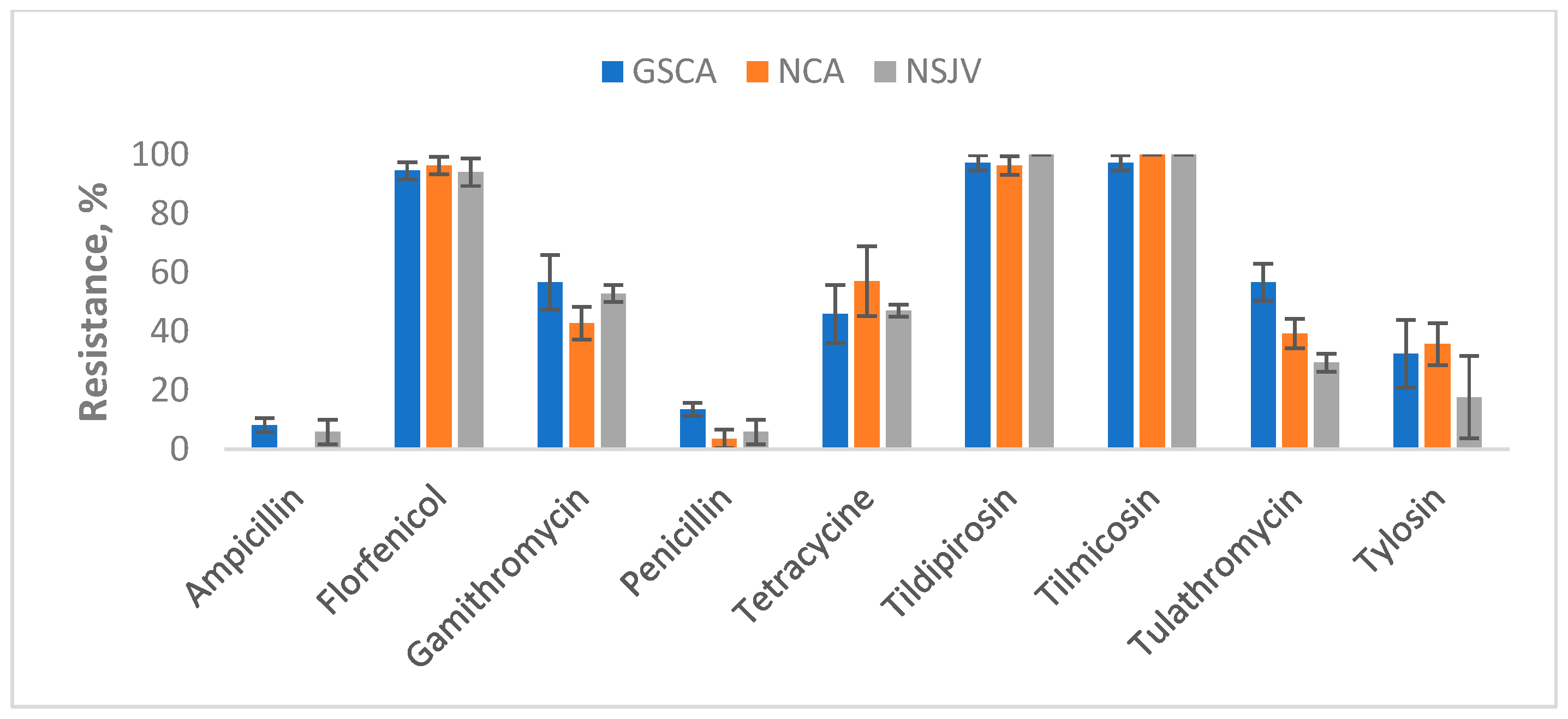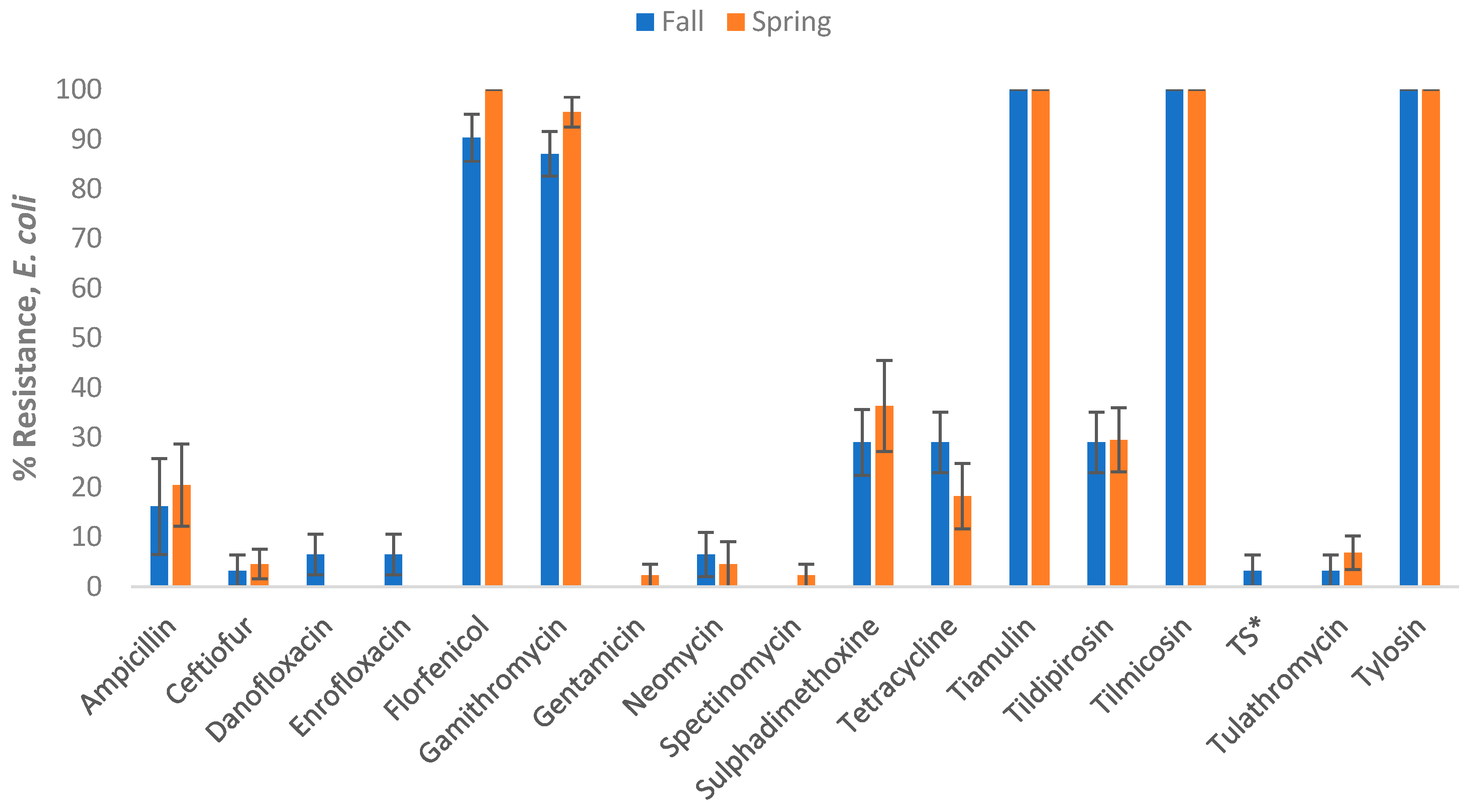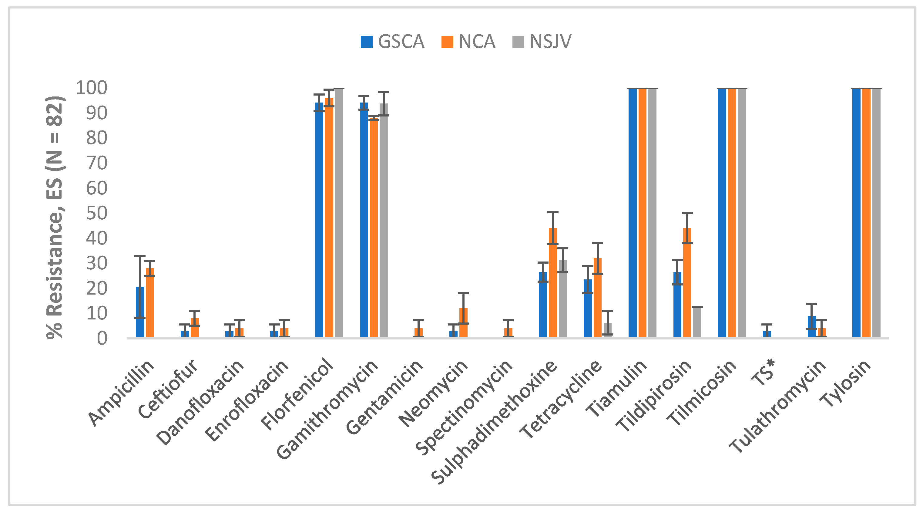 E. coli and ES isolates showed resistance against tiamulin. Although