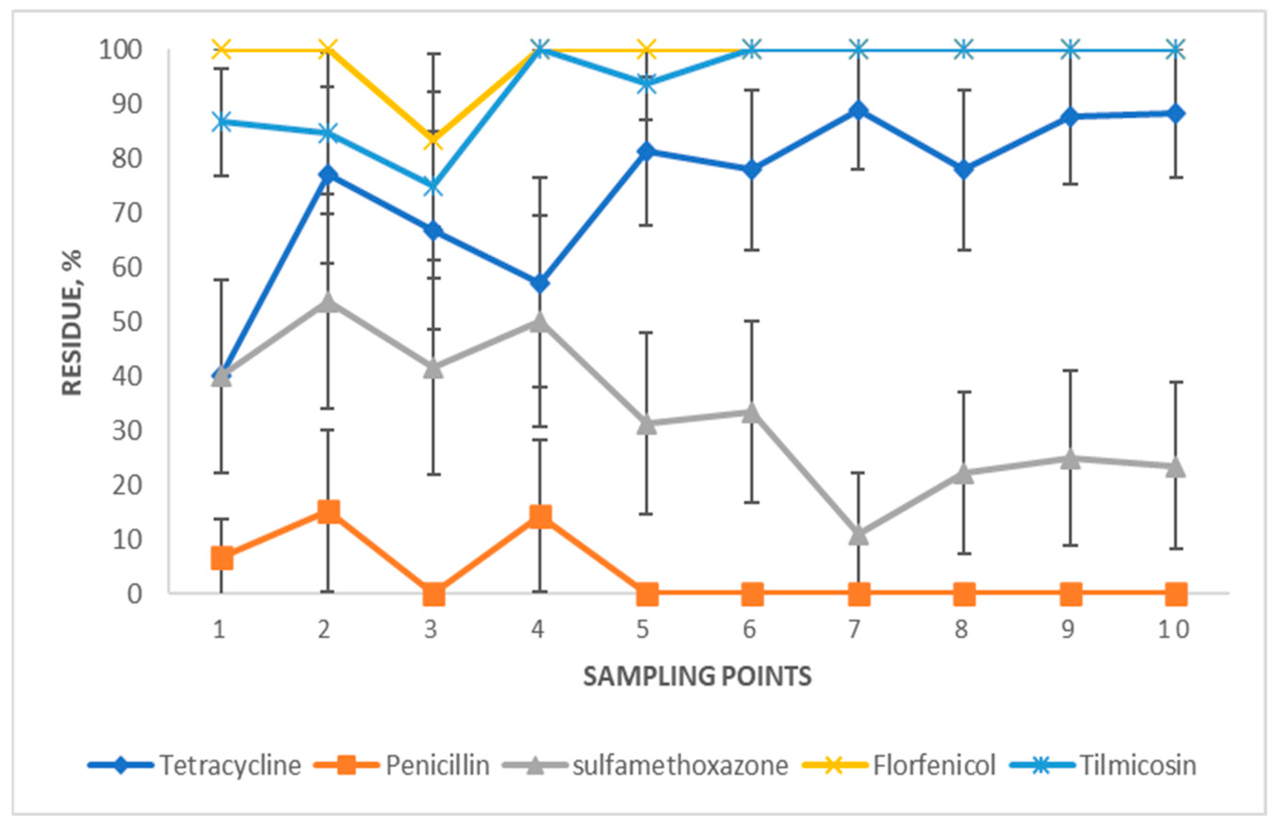 31]. In contrast, a relatively high percentage of lagoon samples had florfenicol or tilmicosin residues. In the US, florfenicol is not labeled for use in lactating dairy cows, but it is labeled for use in calves [