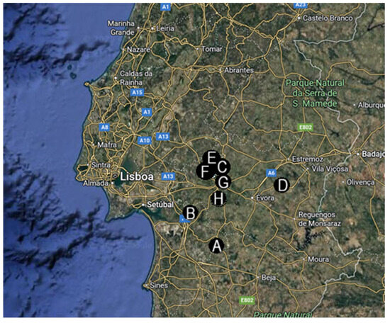 Geographic locations of the eight farms selected for this study. (A–D)—conventional management farms; (E–H)—holistic management farms; all farms were located in Portugal (mainland) (map retrieved from Google Earth, Google LLC).