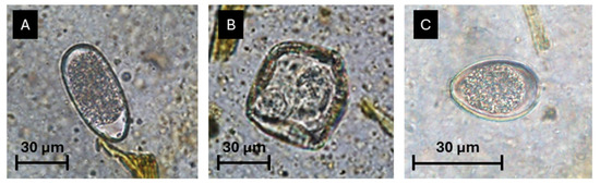 Helminth eggs and coccidia oocysts mostly identified using the “3-in-1” coprological procedure: (A) strongyle egg; (B) Moniezia spp. egg; (C) coccidia oocyst; scale bars—30 µm (original photos).