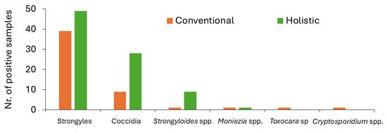 Regarding the holistic management farms, it was found that strongyle eggs were the most frequent (98%), followed by Eimeria spp. oocysts (56%). In addition, Strongyloides sp. eggs were revealed to be more frequent in this system, in comparison to conventional management (18%). Also, one sample was positive for Moniezia spp. eggs (2%). In this system, faecal egg counts ranged between 0 and 165 EPG for strongyle eggs, between 0 and 40 OPG for coccidia oocysts, and the highest Strongyloides sp. egg shedding totalled 10 EPG.