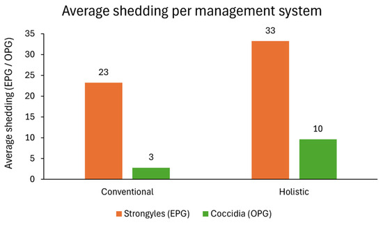 Overall, strongyle eggs were the most common GI parasitic forms, with a higher shedding being detected in faeces from holistic management animals. The same happened for coccidia oocysts, which were the second most common parasite found in quantitative methods, followed by Strongyloides spp. eggs, which presented a total of 55 EPG in cattle from holistic management farms and 5 EPG in conventional management farms. On average, animals excreted strongyle eggs in a range of 23–33 EPG, and coccidia oocysts ranged 3–10 OPG (Figure 4).