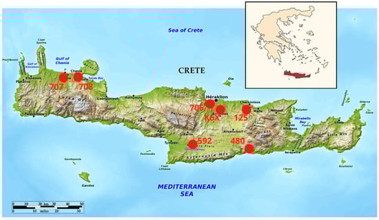 The exact spots in the island of Crete (Greece) where the infected Eurasian griffon vultures were detected with the provided ID numbers of the birds.