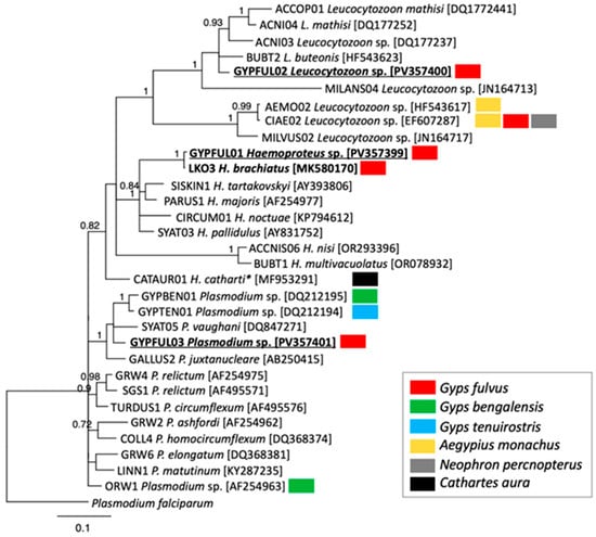 Bayesian inference phylogeny of 32 haemosporidian cytochrome b gene sequences, including 28 from previously identified genetic lineages retrieved from the MalAvi database, three newly recorded lineages, and Plasmodium falciparum sequence obtained from GenBank, which was used as an outgroup. The provided MalAvi lineage code is followed by the species name (where available) and the GenBank accession number in parenthesis. All genetic lineages obtained in this study are bold; additionally, new genetic lineages are underlined. The color boxes represent different vulture species and indicate next to the genetic lineages which lineages were recorded in these species in previous molecular studies. Posterior probabilities > 70 are indicated on the tree. * The lineage referred to H. cathartic—a parasite which requires additional analysis for its taxonomic clarification [].