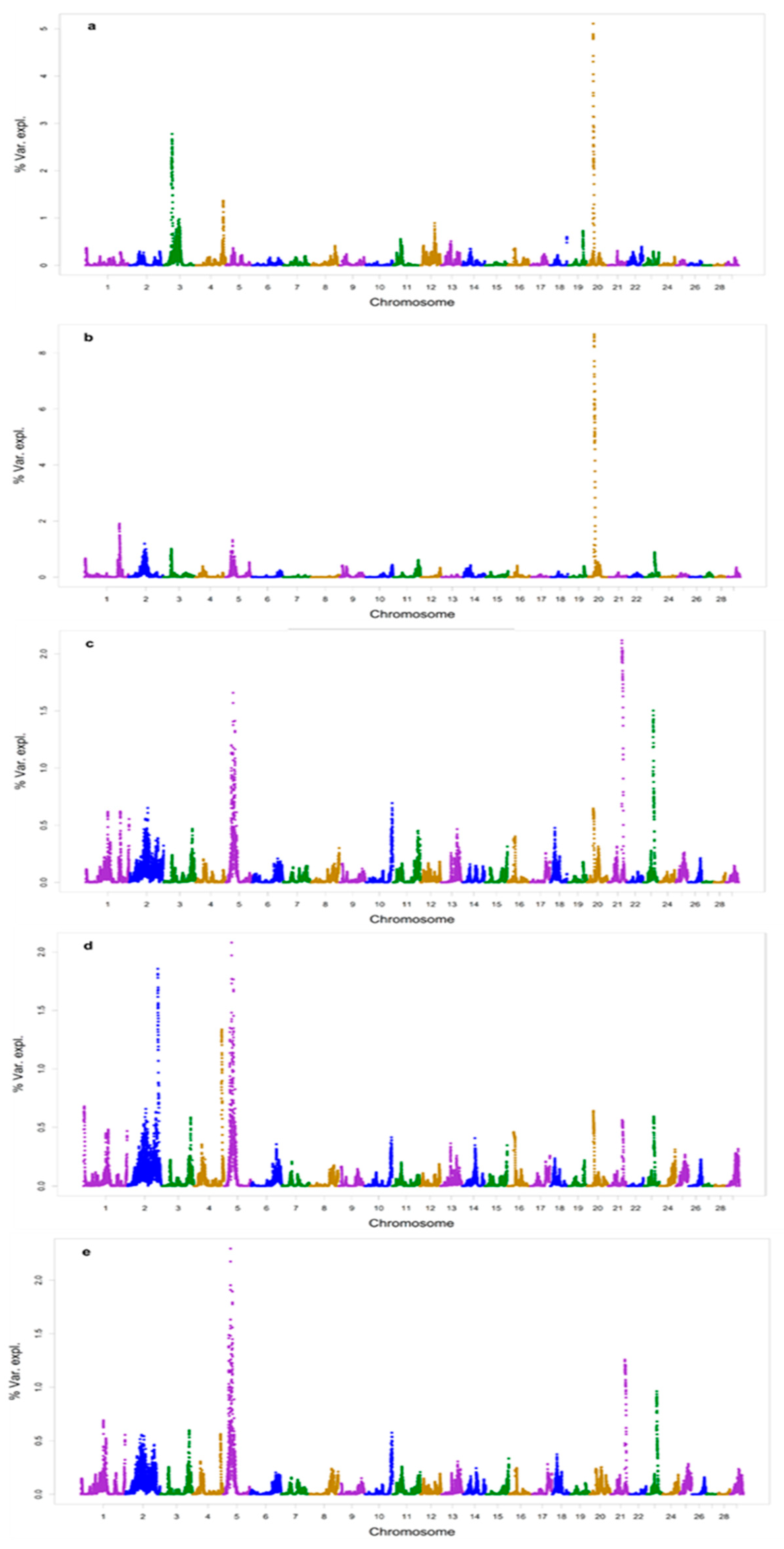 - Irano, N.; de Camargo, G.M.F.; Costa, R.B.; Terakado, A.P.N.; Magalhães, A.F.B.; Silva, R.M.d.O.; Dias, M.M.; Bignardi, A.B.; Baldi, F.; Carvalheiro, R.; et al. Genome-Wide Association Study for Indicator Traits of Sexual Precocity in Nellore Cattle. PLoS ONE 2016, 11, e0159502. [Google Scholar] [CrossRef]