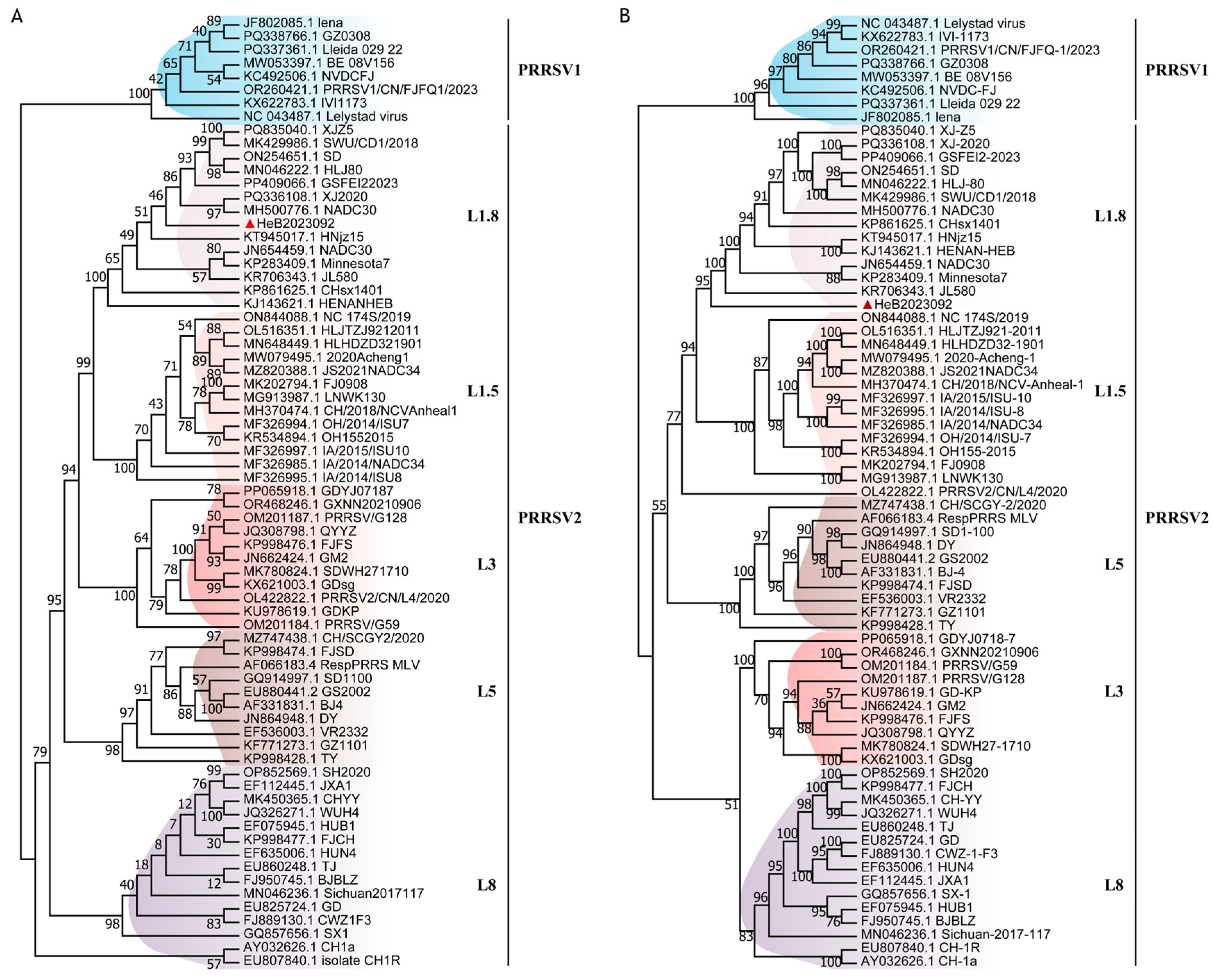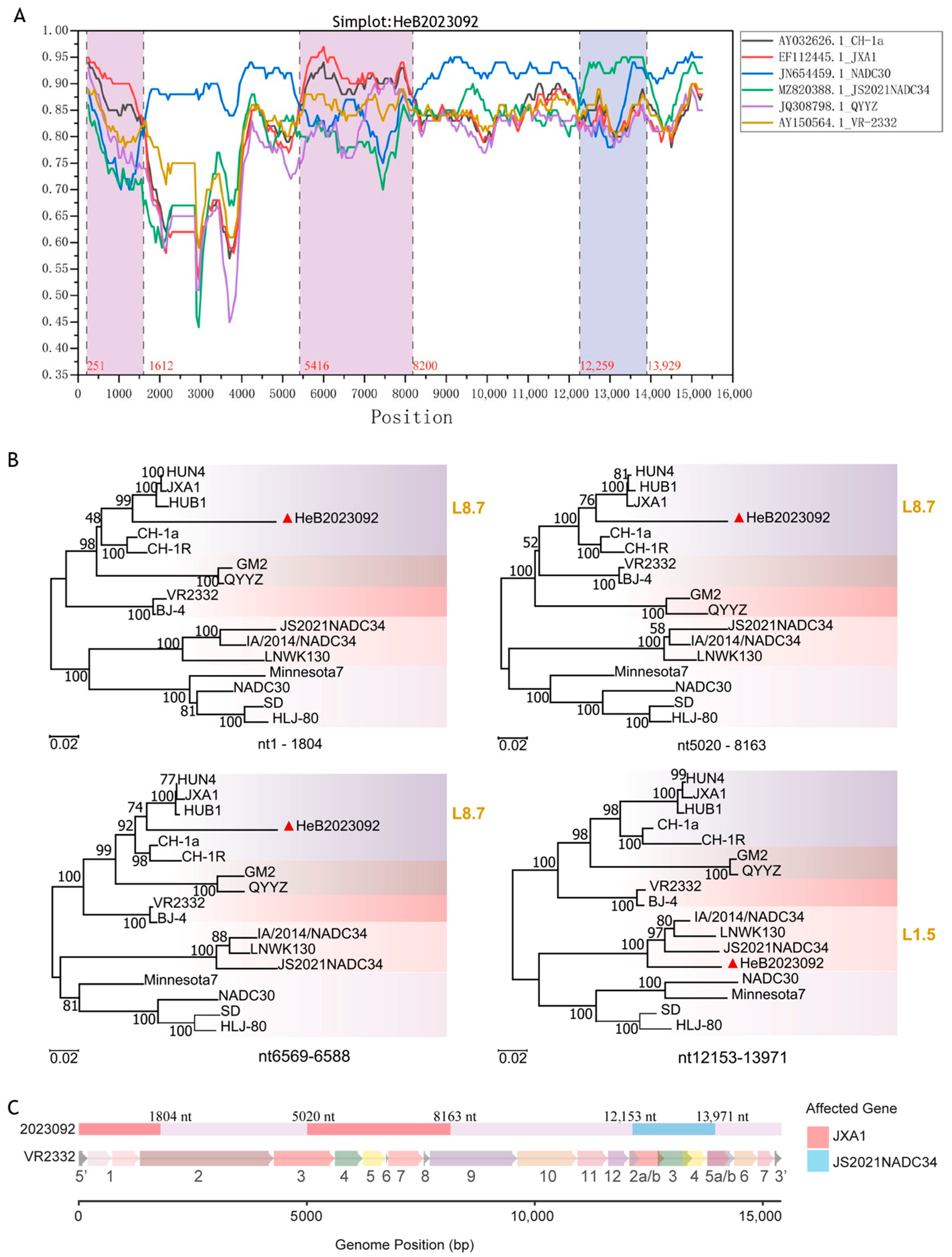 - Chang, H.; Gao, X.; Wu, Y.; Wang, F.; Lai, M.; Zheng, J.; Qiu, Y.; He, Y.; Liang, X.; Yuan, K.; et al. Genomic and pathogenicity analysis of two novel highly pathogenic recombinant NADC30-like PRRSV strains in China, in 2023. Microbiol. Spectr. 2024, 12, e0036824. [Google Scholar] [CrossRef]