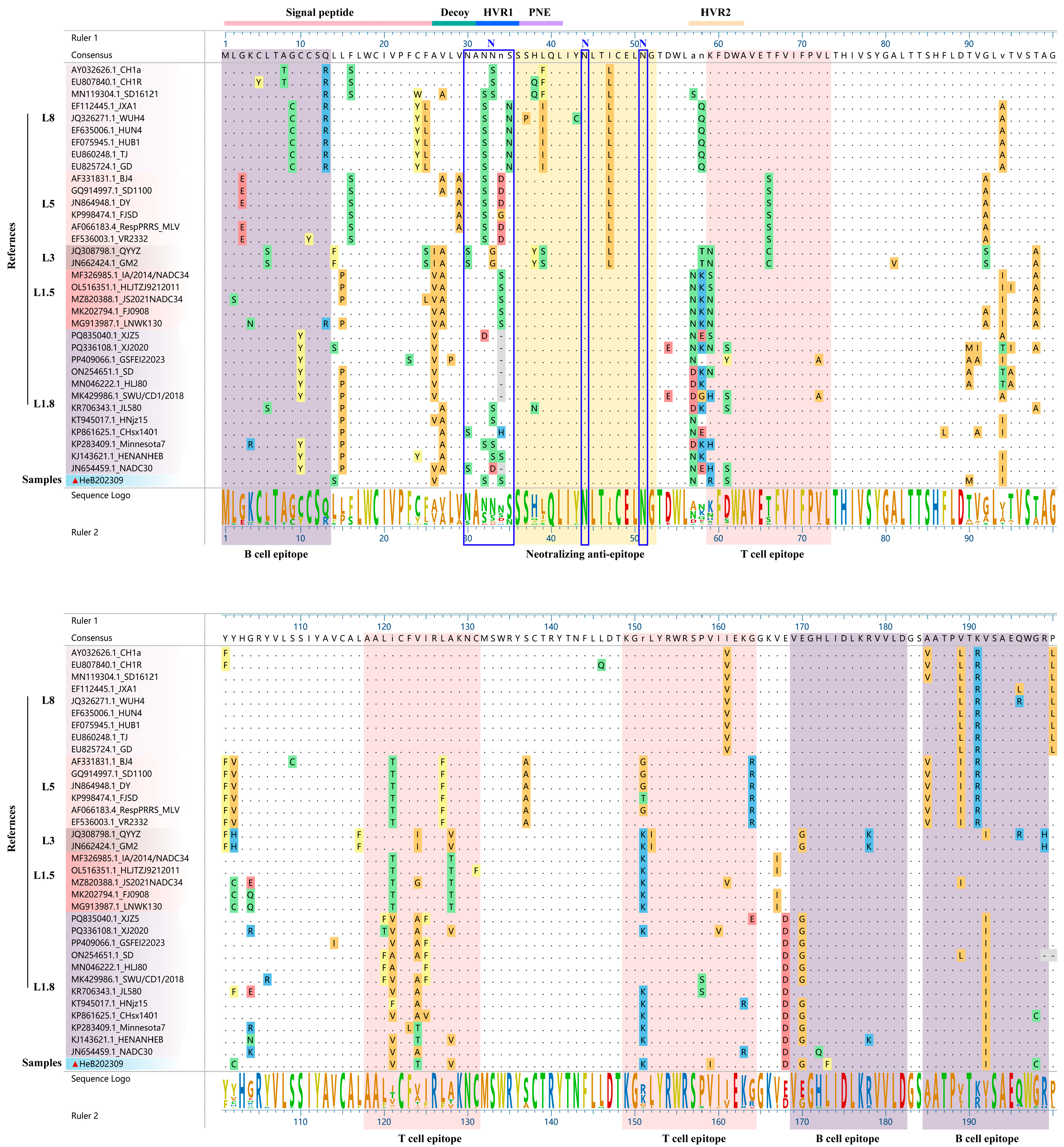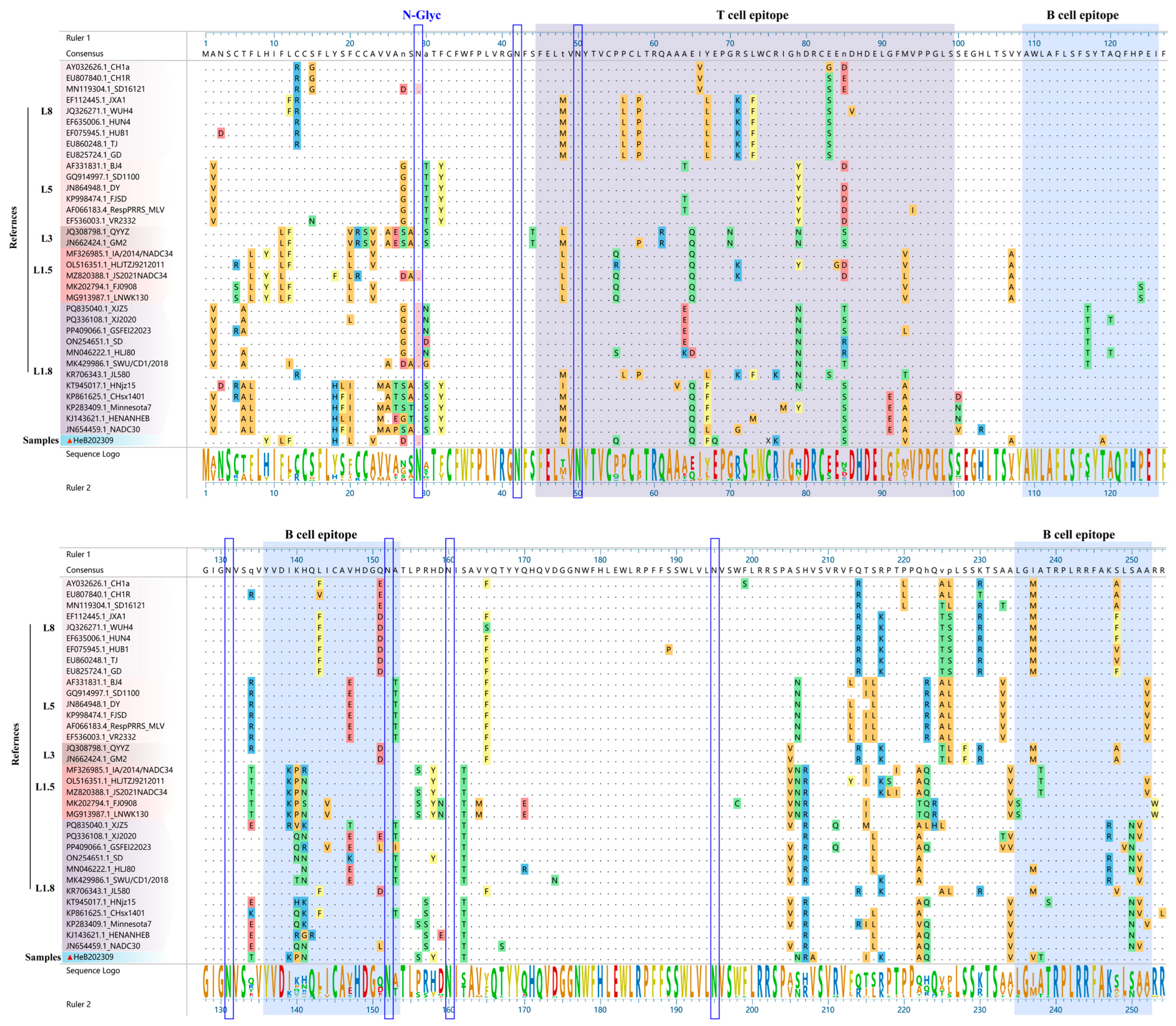 - Li, G.; Li, Y.; He, C.; Liu, X.; Lv, C.; Liu, K.; Yu, X.; Zhao, M. Sequence analysis of the GP5 protein of porcine reproductive and respiratory syndrome virus in Vietnam from 2007 to 2023. Front Microbiol. 2024, 15, 1475208. [Google Scholar] [CrossRef] [PubMed]