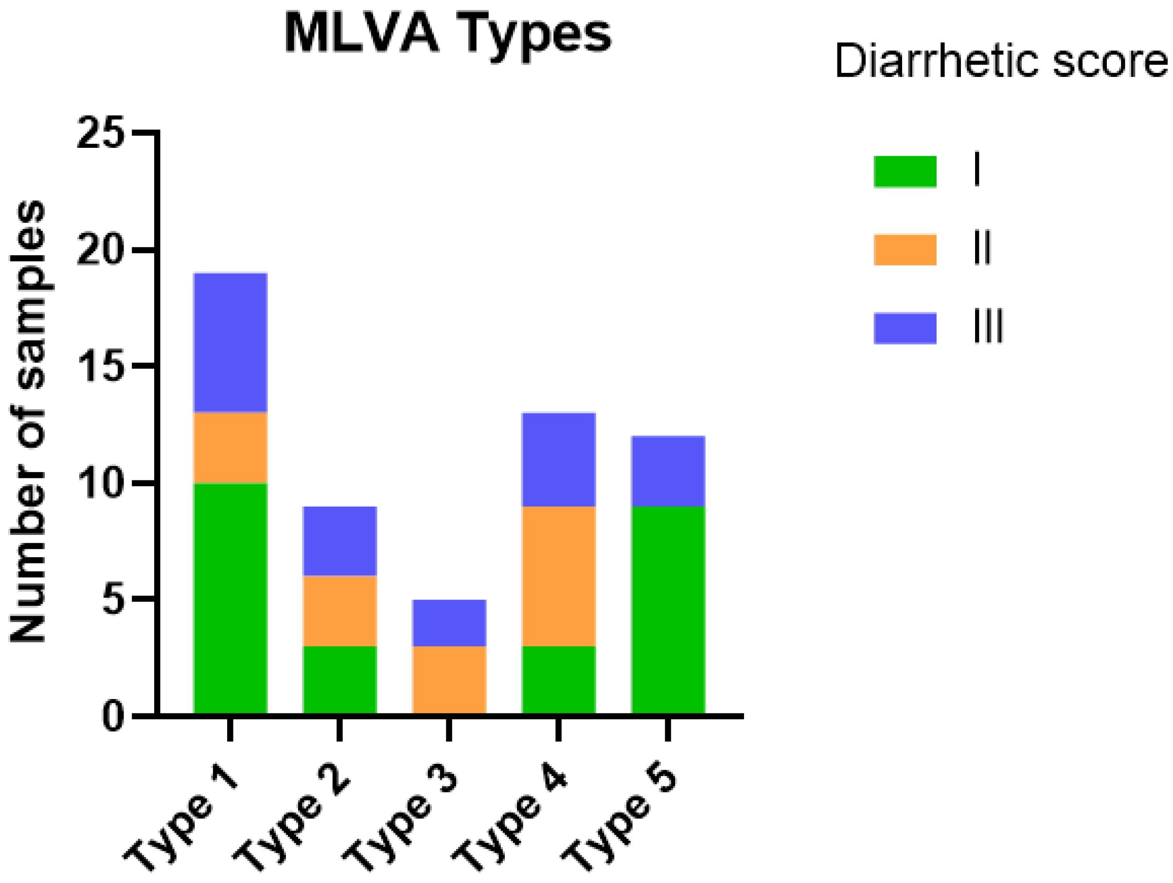 3.3. MLVA Types, Diarrhetic Scores and Quantity of E. coli