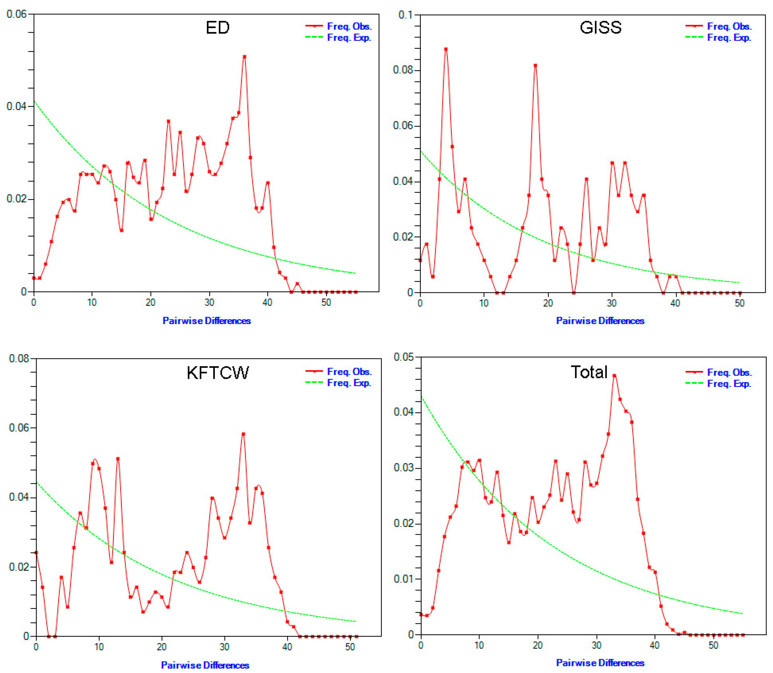 Neutrality tests using Fu and Li’s D and F statistics produced non-significant positive values for all breeds, indicating no strong deviation from neutrality (Table 3). Tajima’s D values were likewise non-significant (ED = 0.0079, KFTCW = 0.6404, and GISS = 0.3688), whereas Fu’s Fs values were significantly negative (ED = −24.11, KFTCW = −19.66, and GISS = −6.11; all p < 0.05), consistent with recent demographic expansion. Mismatch distribution analysis, assessed through the raggedness index (Rag) and R2 statistic, provided more insight into demographic patterns. Low Rag and R2 values in ED and the total dataset (Rag = 0.0024, R2 = 0.1155 for ED; Rag = 0.0012, R2 = 0.0927 for total) are compatible with recent demographic expansion under a sudden expansion model (Table 3). In contrast, higher values in KFTCW and GISS suggest either population stability, genetic structure, or a lack of recent expansion (Figure 2). In some cases, the calculation of SSD and p-values did not converge in Arlequin, likely reflecting complex demographic histories and moderate sample sizes. Nevertheless, the concordance of Fu’s Fs with mismatch-based indices (Rag, R2) and observed vs. expected curves supports a demographic expansion signal in Edilbay and in the pooled dataset.