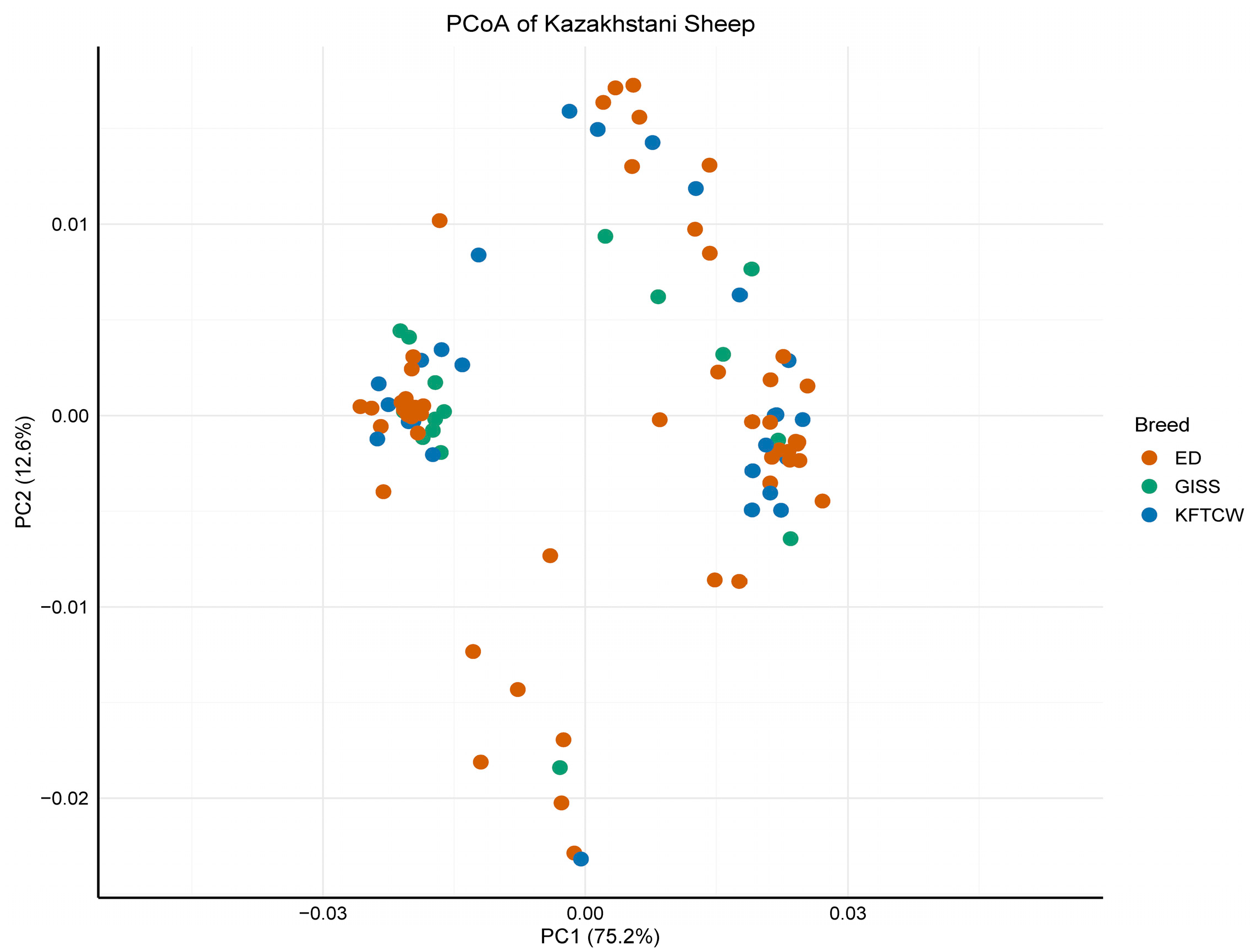 Figure 4. Principal Coordinate Analysis (PCoA) of 115 Kazakhstani sheep individuals based on TN93—pairwise genetic distances. Points represent individual samples, colored by breed according to Figure 1. The first two principal coordinates explain 87.8% of the total variation (75.2% and 12.6%, respectively).