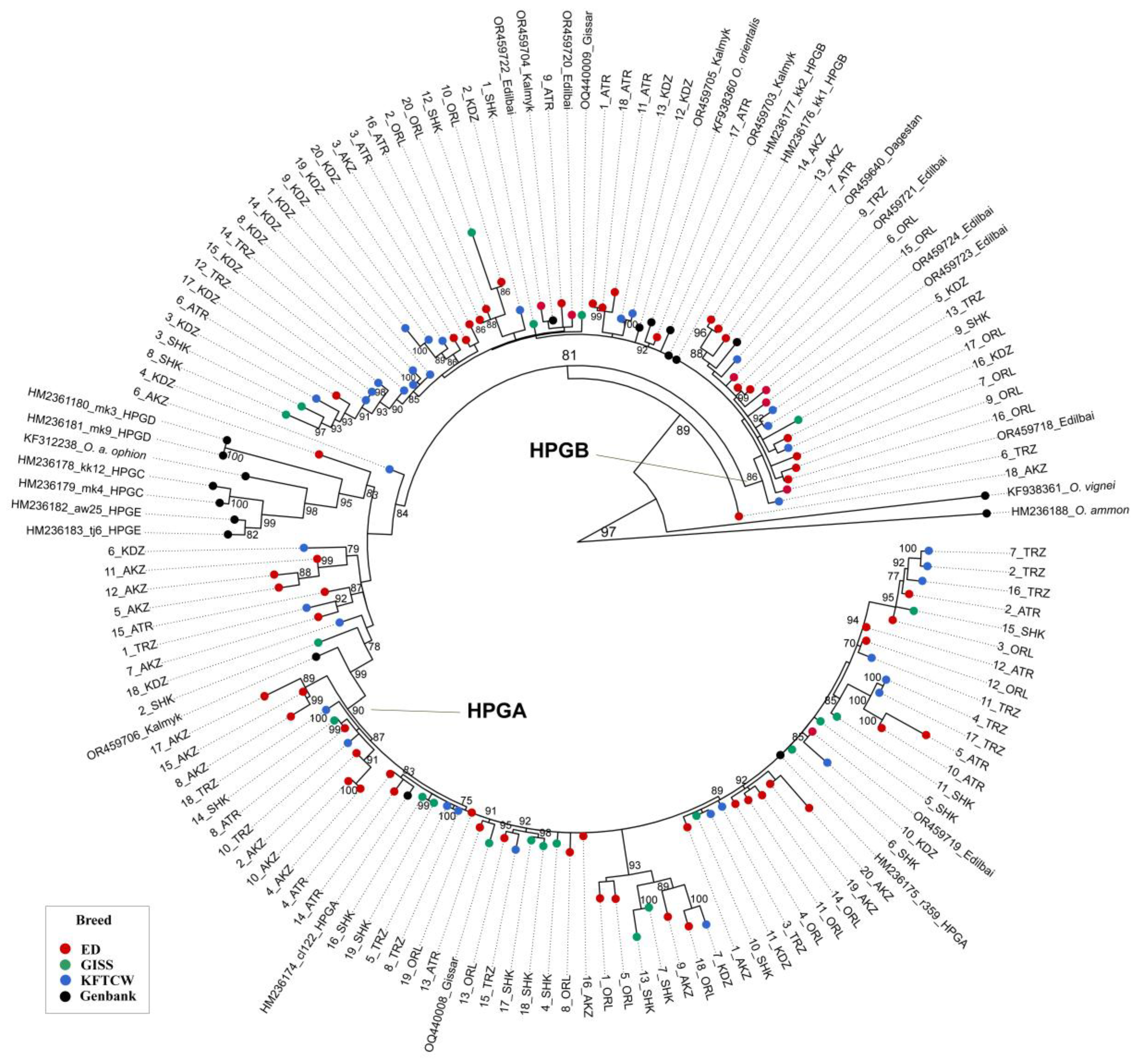 The clustering of O. orientalis (Asiatic mouflon) within HPGB agrees with earlier genetic evidence for its role as a direct maternal contributor to haplogroup B [1,19]. The relatively high HPGB proportion in our dataset, higher than in some Iranian and Anatolian flocks [7,18], may reflect secondary introgression from western flocks or selective breeding preferences favoring HPGB lineages.