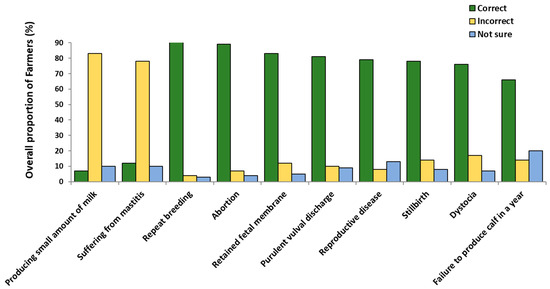 Across all 301 respondents, 285 (95%) reported having experienced infertility in their dairy herds, a relatively uniform result across the study regions (range across regions: 94–98% of respondents; Figure 2 and Table 1). The high proportion of respondents reporting that they had experienced infertility was consistent with the high proportion who correctly understood the signs of infertility. Overall, the median number of questions on the signs of infertility that were answered correctly was 7/10 (ranging, at the individual farmer level, from 2 to 10 correct). Across the 10 separate questions, the proportion of correct respondents ranged from 282/301 (94%) who identified repeat breeding as a sign of infertility, to 199/301 (66%) who identified failure to produce a calf in a year.