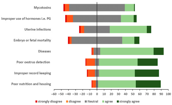 The opinions of Tanzanian smallholder dairy farmers on the causes of infertility on their farms. The x-axis is the overall percentage of respondents (n = 285) in each category, with ‘0’ being the midpoint of the ‘neutral’ response.
