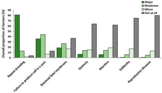 Farmers’ perception of the importance of different infertility conditions is likely to depend on how often they observe these conditions. For example, most farmers would encounter cows that need multiple inseminations to become pregnant (i.e., returns to oestrus), so it is not surprising that they ascribe to it a high level of significance, although other forms of infertility (i.e., abortion, stillbirth, RFM) have a much greater impact on the productivity of the individual animal [33,34,35]. In other words, because of the lower frequency (compared to repeat breeding) of these latter forms of infertility, farmers tend to underestimate their impact. However, their occurrence not only impacts farmers in terms of costs associated with veterinary services but also affects the animals by reducing production [36,37] and shortening overall lifetime productivity [38,39]. For example, in Tanzania, a study by Kashoma and Ngou [40] showed that RFM causes a significant economic loss (i.e., 364,133.00 Tanzanian shillings (157.00 USD) per cow, reduced milk production (95.4%) and treatment costs (4.6%)). On top of these losses to the farmer, RFM leaves the animal sub-fertile even after successful treatment and recovery. Similarly, in developed countries, RFM has been reported to reduce milk sales and an overall reduction in animal fertility [41,42].