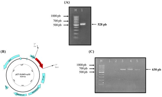 (A) Amplification of the CP204L gene, with a size of 528 bp (M—marker; 1—amplicon CP204L). (B) Expression vector pET-SUMO-rp30, with the insert corresponding to the CP204L gene (ASFV-p30) and primers at the corresponding positions for targeting analysis. (C) Targeting analysis of the CP204L gene in the expression vector (M—marker; 1/2—blank control; 3/5—samples of the expression vector with the insert).