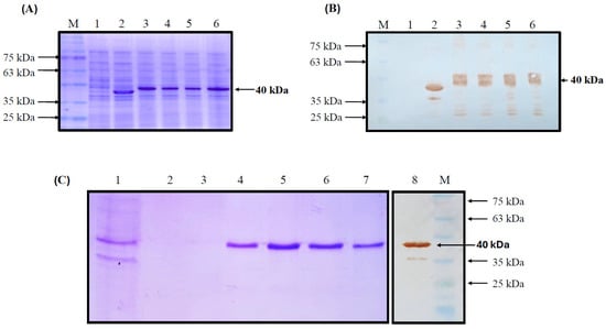 The recombinant pET-SUMO-rp30 system efficiently transformed the production strain E. coli BL21/DE3 and was induced to produce rp30 by IPTG. The recombinant protein was successfully expressed in the expression strain, confirmed by the presence of an overexpressed band at the expected molecular weight of 40 kDa on SDS-PAGE in various transformed strains. Such a band was not observed in the negative control strain (untransformed BL21/DE3) or in the positive control strain (overexpressing a 37 kDa recombinant protein) (Figure 2A). Western blot analysis using 6×-his-tag antibody followed by HRP-conjugated secondary antibody for visualization confirmed the presence of a specific signal for these overexpression bands in the analyzed strains and the positive control (37 kDa recombinant protein), confirming the recovery of rp30 (Figure 2B). The rp30 protein was recovered from the cells in insoluble form as inclusion bodies, which were dissolved in sarcosyl and subsequently purified by IMAC. Figure 2C shows the results of purification with SDS-PAGE and the Western blot analysis of the recombinant, which was identified as a single band with a specific signal at 40 kDa in the elution samples obtained by chromatography, without the presence of contaminating protein bands. The final protein concentration was 30 µg/mL, indicating a production yield of 3 mg per 100 mL.
