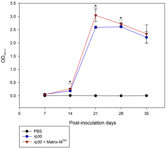 The antibody production capacity of rp30 in CF-1 mice is represented as the production kinetics, obtained from the data provided by the iELISA, using the pure protein as the antigen. Figure 3 shows the antibody production in mice, and it was observed that the group inoculated with rp30 alone, 14 days post-inoculation (2nd dose), produced high levels of specific antibodies, with a significant difference (* p ≥ 0.05) on day 21 compared to the group administered with the adjuvant. However, a similar effect to the group inoculated with rp30 plus adjuvant was observed throughout the other days, indicating that the protein alone has a high antigenic effect, which was maintained until day 35. These results imply that the rp30 protein produced through the bacterial expression system contains the necessary elements to generate specific antibodies and is capable of sustaining this production over time.