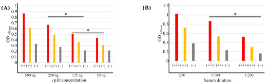 Evaluation of the optimal concentration of antigen (A) and serum (B) for iELISA standardization. Optimal conditions were considered when 50 ng was used for each plate and 1:100 dilutions were used for the sera evaluated. Statistically significant differences were considered at * p ≤ 0.05.