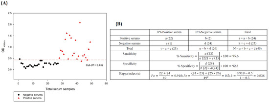 The cut-off was determined by evaluating 25 negative reference sera under the optimized iELISA criteria, resulting in 0.232 at a SD of 0.1. Cut-off score plus 2 SD was 0.432 (Figure 5A). Samples having an OD greater than the cut-off were judged positive, while the ones that remained below the cut-off were declared negative. ODs that remained between the critical point and the cut-off point were deemed suspicious, requiring confirmation using the IPT.