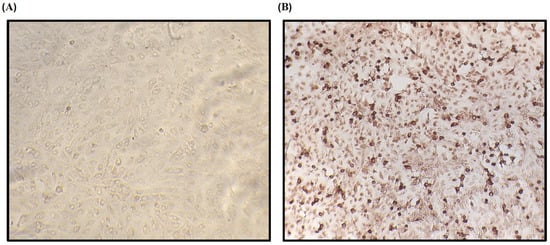 Sensitivity, specificity, and the κ index were evaluated using a 2 × 2 contingency table. Under the experimental conditions mentioned above and using the reference serum bank of the OIE-ASF reference laboratory, sensitivity and specificity were 95.6% and 92.3%, respectively. Κ value has been 0.836, which indicates a perfect correlation between the iELISA evaluations and the IPT reference test (Figure 5B). In the IPT, considered the standard and reference test for ASF diagnosis in Spain, a specific intracellular signal was observed for ASFV-infected cells corresponding to cells containing active virus replication and thus recognized by the antibodies present in the sera of infected pigs, contrary to the negative sera samples, in which these antibodies were not observed in the cells (Figure 6). Finally, all the sera used in this study correspond to the expected result, which confirms the specificity of the developed immunoassay.