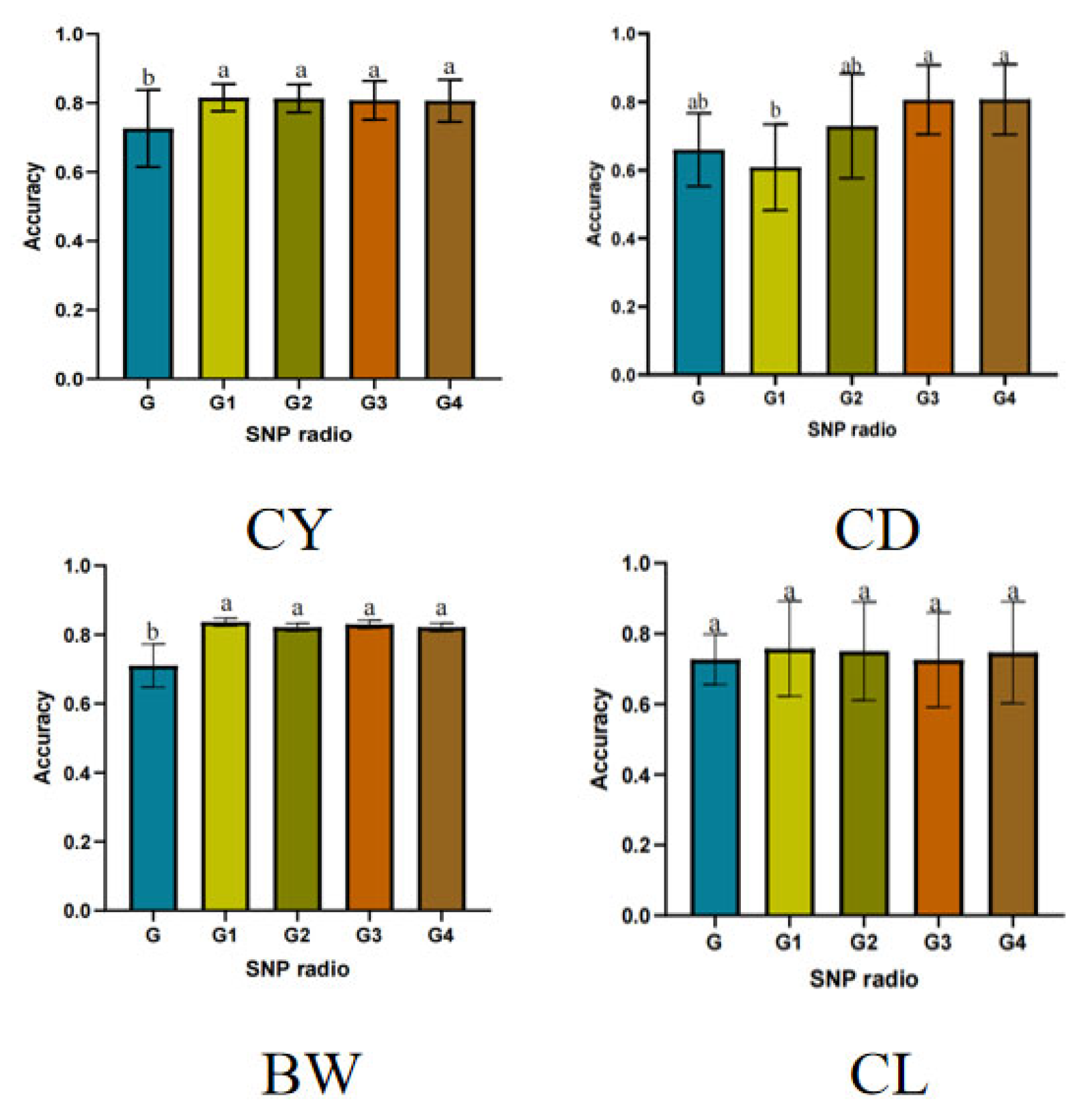 2.4. Evaluation for Accuracy of Genomic Breeding Value