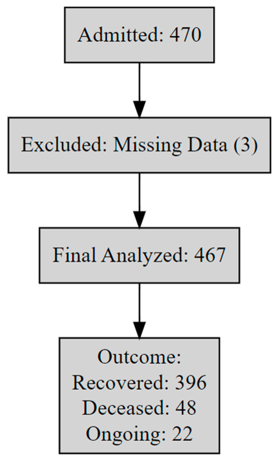 Flow diagram of case inclusion. A total of 470 elephants were admitted between 2019 and 2024; after excluding 3 cases with missing data, 467 were analyzed. Treatment outcomes were classified as of 31 December 2024 into three mutually exclusive categories: (1) Deceased: died during hospitalization; (2) Ongoing: still under care at the censoring date; and (3) Recovered: discharged in stable condition. Although “ongoing” is not a terminal outcome, it was retained to reflect unresolved cases in real-time and allow the model to differentiate them.