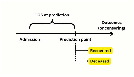 Schematic illustration of the relationship between admission, length of stay (LOS), and outcome in hospitalized elephants. The LOS at classification represents the duration from hospital admission to the point at which the model makes a prognosis. Outcomes (recovered or deceased) occur after this prediction point. Ongoing cases are censored at the cutoff date (31 December 2024). This time-aware structure ensures that LOS precedes the outcome and avoids temporal bias.
