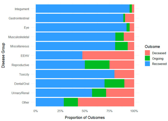 Proportion of treatment outcomes by disease group is presented in Figure 3. Presenting conditions most commonly involved the integumentary, gastrointestinal, and eye systems. Most elephants recovered, while fewer were classified as deceased or ongoing at the time of data censoring. Outcome distributions varied substantially by disease category. Mortality was highest in elephants diagnosed with EEHV, toxicity, or rare conditions grouped under “Other”. In contrast, integumentary and eye diseases were strongly associated with recovery. Notably, some high-mortality categories (e.g., toxicity) demonstrated broad outcome variability, suggesting heterogeneous clinical trajectories within the same disease group.