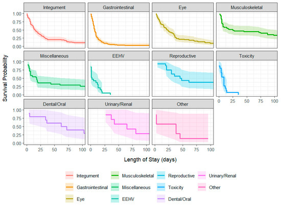 Kaplan–Meier survival curves illustrated distinct divergence between acute and chronic disease trajectories (Figure 5). EEHV and toxicity displayed steep declines within the first week, while integumentary, reproductive, and musculoskeletal disorders exhibited more gradual reductions in survival probability. Full risk tables for all group are provided in Supplementary File S3.
