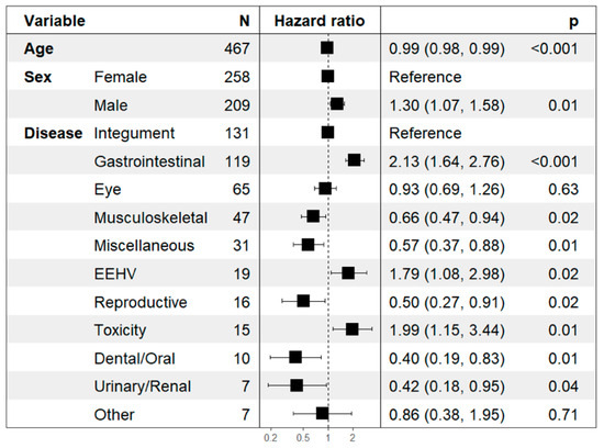 Cox proportional hazards regressions confirmed that age and disease group were significant predictors of time to discharge or death (Figure 6). Gastrointestinal disease (Hazard Ratio [HR] = 1.92), EEHV (HR = 2.47), and toxicity (HR = 2.14) were associated with significantly increased hazards, suggesting more rapid clinical deterioration and increased urgency for intervention.