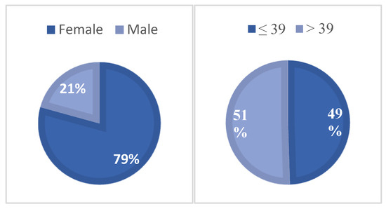 Distribution of respondents by sex (left) and by age group based on the median age of 39 years (right).