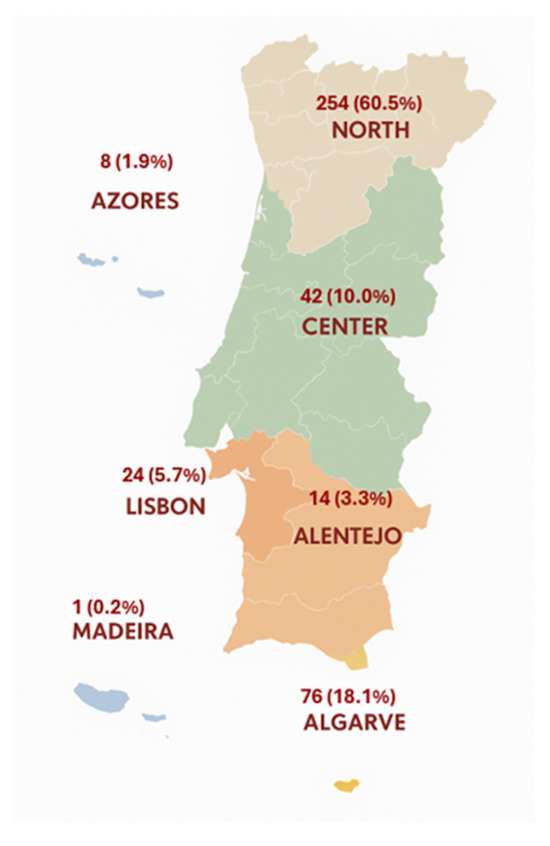 Regarding geographical distribution, most respondents resided in the Northern region, accounting for 60.5% (n = 254). This was followed by the Algarve, with 18.1% (n = 76), and the Central region, with 10.0% (n = 42). The Lisbon Metropolitan Area represented 5.7% (n = 24) of the participants, while the Alentejo region accounted for 3.3% (n = 14). The Autonomous Regions were less represented: 1.9% (n = 8) from the Azores and 0.2% (n = 1) from Madeira (Figure 2).