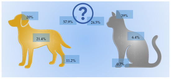 A total of 61.9% owned more than one pet, while 38.1% had only one. Regarding species, 40.2% owned only dogs, 23.1% only cats, and 36.7% multiple types of animals. The most frequent combinations were dogs and cats (23.1%), followed by a combination of dogs, cats, and exotic animals.