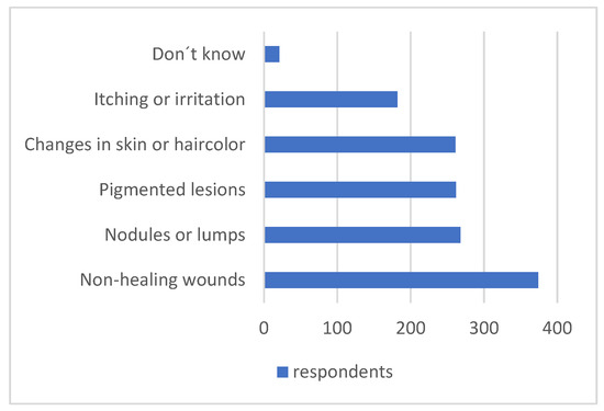 A considerable portion of respondents recognized suspicious clinical signs, and only 4.8% (n = 21) reported not knowing. The most frequently recognized signs were non-healing wounds (89.0%; n = 374), followed closely by nodules or lumps (63.8%; n = 268), pigmented lesions or moles (62.4%; n = 262), and changes in skin or hair color (62.1%; n = 261). Itching or irritation was acknowledged by 43.3% (n = 182) of participants (Figure 4).