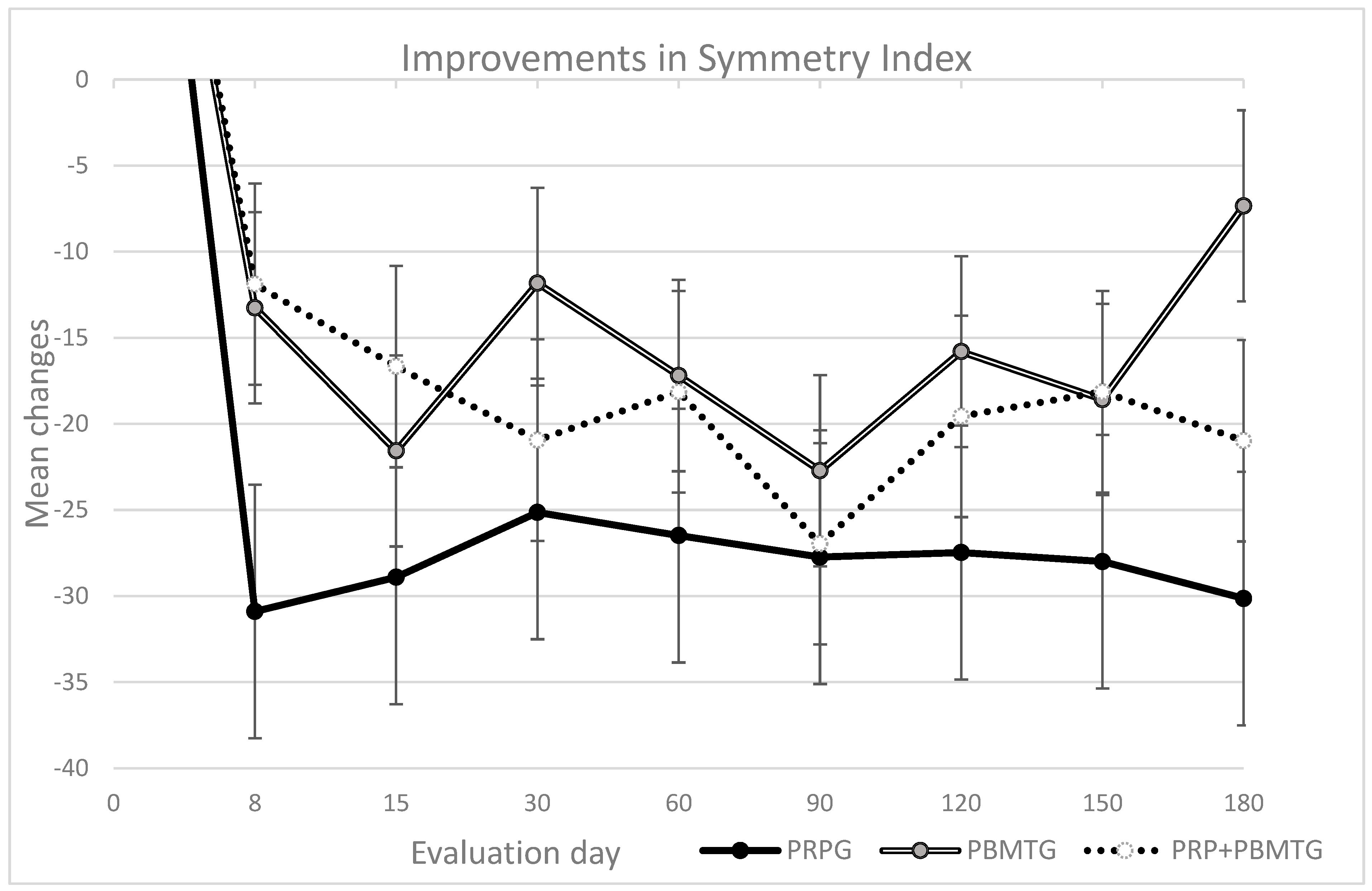 | PRP + PBMTG | 4.5 | 4.5 | −1.5 | 4.0 | 3.8 | −2.0 | 4.0 | 3.8 | −2.0 | 4.5 | 3.8 | −1.5 | |||||||||||||||||||||||||||||||||
