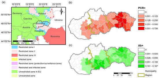 (a) Location of Slovakia within Europe and current EU ASF zoning, and (b) cumulative density (ind./km2) of virologically and (c) serologically positive ASF cases in Slovakia during 2019–2024.
