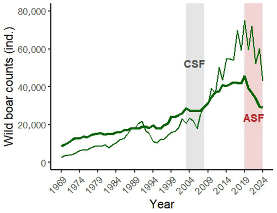 Long-term trend in wild boar pre-harvest counts (thick line) and harvest (thin line) in Slovakia from 1969 to 2024, highlighting the effects of classical swine fever (CSF; 2003–2008) and African swine fever (ASF; 2019–present) on the wild boar population and its management.