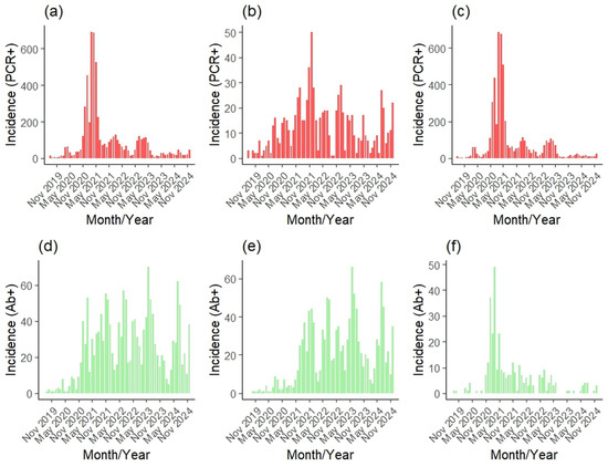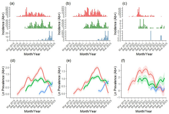 Serological (Ab+) ASF incidence and prevalence within eastern (red), central (green) and western (blue) Slovakia during 2019–2024 by the overall (a,d), active (b,e) and passive (d,f) monitoring.