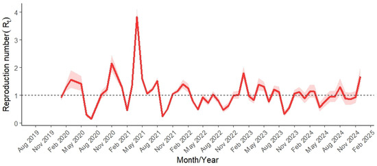 with ws; denoting the probability that a secondary case occurs s time units after a primary case, derived from the SI distribution. Incidence was assumed to follow a Poisson process, and the posterior distribution of Rt was obtained from a Gamma prior, updated over a sliding window of length τ. We applied a parametric gamma-distributed SI with a mean of 1.5 months and a standard deviation of 0.5 months, reflecting ASF incubation and virus persistence in wild boar carcasses [8,24]. Estimation was initiated once the cumulative incidence exceeded 40 cases (January 2020). For interpretation, values of Rt > 1 indicate sustained epidemic growth, while Rt < 1 suggests declining transmission. Parts of the R coding and language editing were supported by the AI-based language model ChatGPT 5.0 [25].