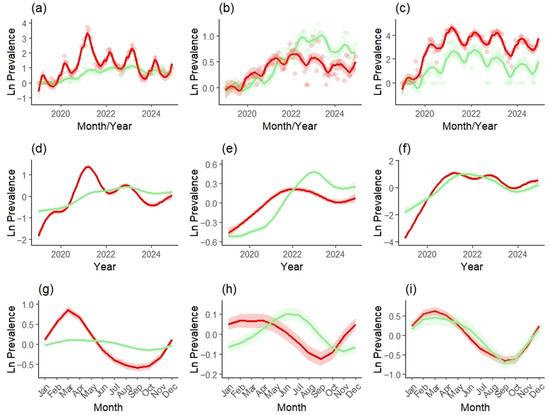 Predicted viro-(red) and sero-(green) prevalence (Ln-transformed) by the overall (a,d,g), active (b,e,h) and passive monitoring (c,f,i) in Slovakia during 2019–2024. Top row shows predictions compared to real data (a–c), middle row shows the annual effect (d–f) and bottom row shows the seasonal—annually repeating effect (g–i).
