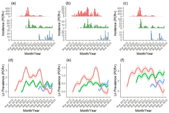 Virological (PCR+) ASF incidence and prevalence within eastern (red), central (green) and western (blue) Slovakia during 2019–2024 by the overall (a,d), active (b,e) and passive (c,f) monitoring.