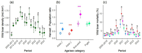 (a) Average wild boar density (mean ± SE) in Slovakia calculated from pre-hunting population estimates (solid circles) and from realized harvest (open circles) for the post-CSF period (2009–2013) and the pre-ASF period (2014–2018), as well as for individual years during ASF presence (2019–2024). Different letters indicate significant differences in density between periods (Tukey HSD test, p ≤ 0.05); periods sharing the same letter are not significantly different. (b) Harvest intensity, expressed as the ratio of harvest to the pre-harvest population (mean ± SE), during the disease-free decade (2009–2018; open circles) and in years with ASF presence (2019–2024; solid circles) within each social category. Asterisks denote significant differences between periods (t-test, *** p ≤ 0.001). (c) Average mortality (mean ± SE) of adult males (blue), adult females (red), subadults (purple), and piglets (green) in Slovakia during the disease-free period (2009–2018) and in years with ASF presence (2019–2024). Different letters indicate significant differences in mortality between periods within each social category (Tukey HSD test, p ≤ 0.05); periods within a social category sharing the same letter are not significantly different.