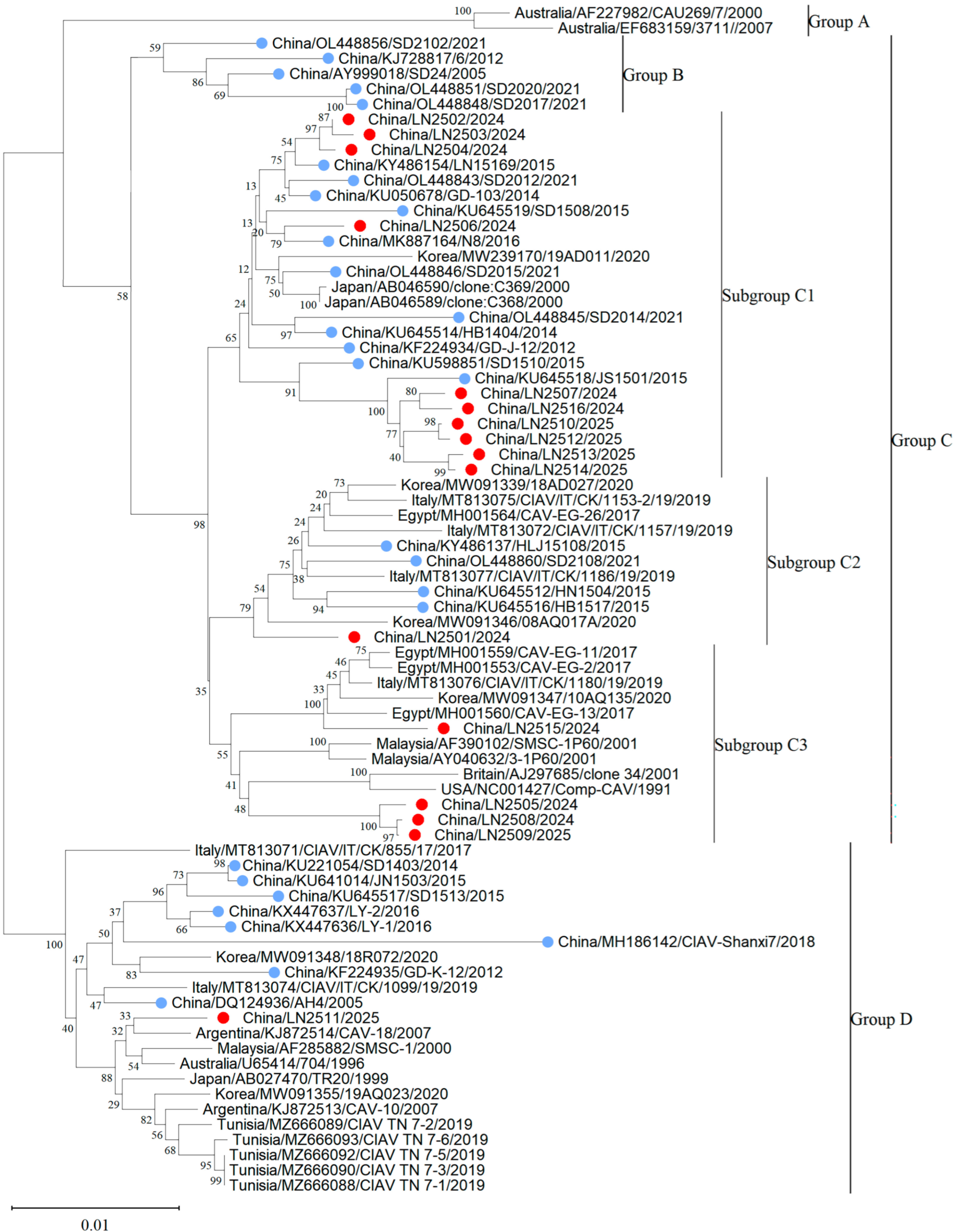 APA StyleLi, Y., Chen, Z., Huang, Y., Hu, S., Lv, Q., & Zhang, P. (2025). Epidemiological Investigation and Molecular Characterization of Chicken Infectious Anemia Virus in Broilers in Liaoning Province, China. Veterinary Sciences, 12(11), 1031. https://doi.org/10.3390/vetsci12111031