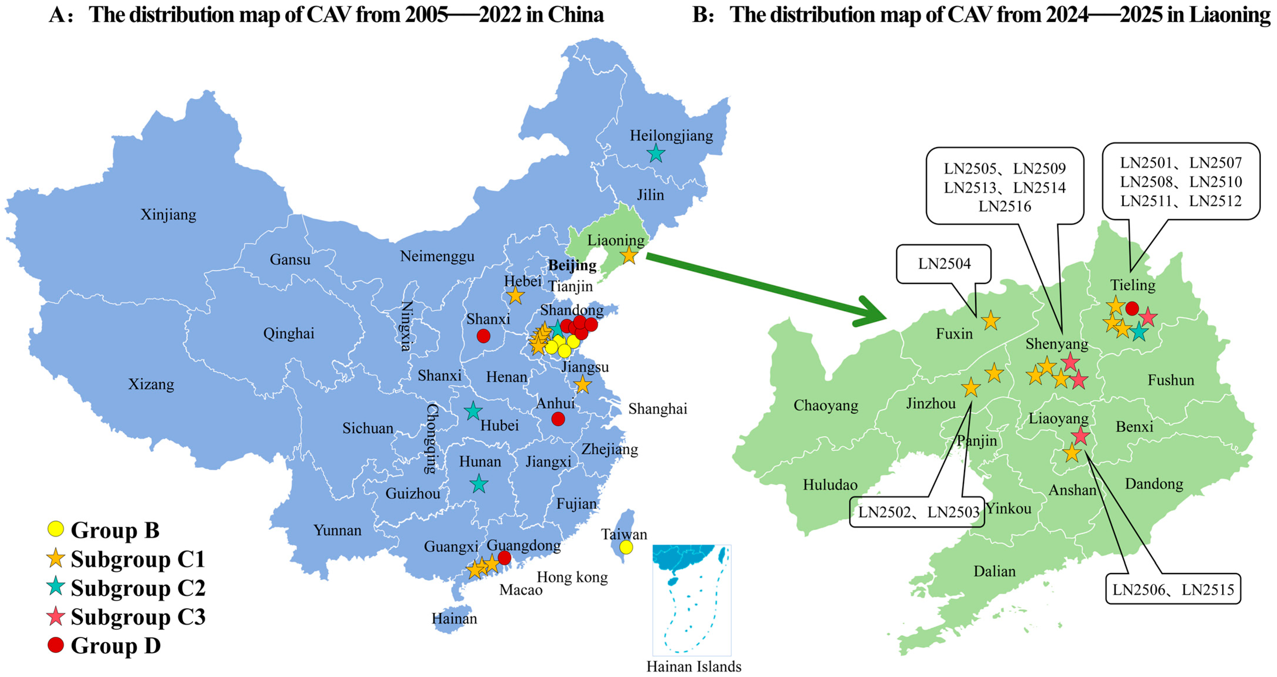 | Location | Positive Rate of CAV (Positive Samples/Total Samples) | Accession No. | Strain Name | Year of Collection |