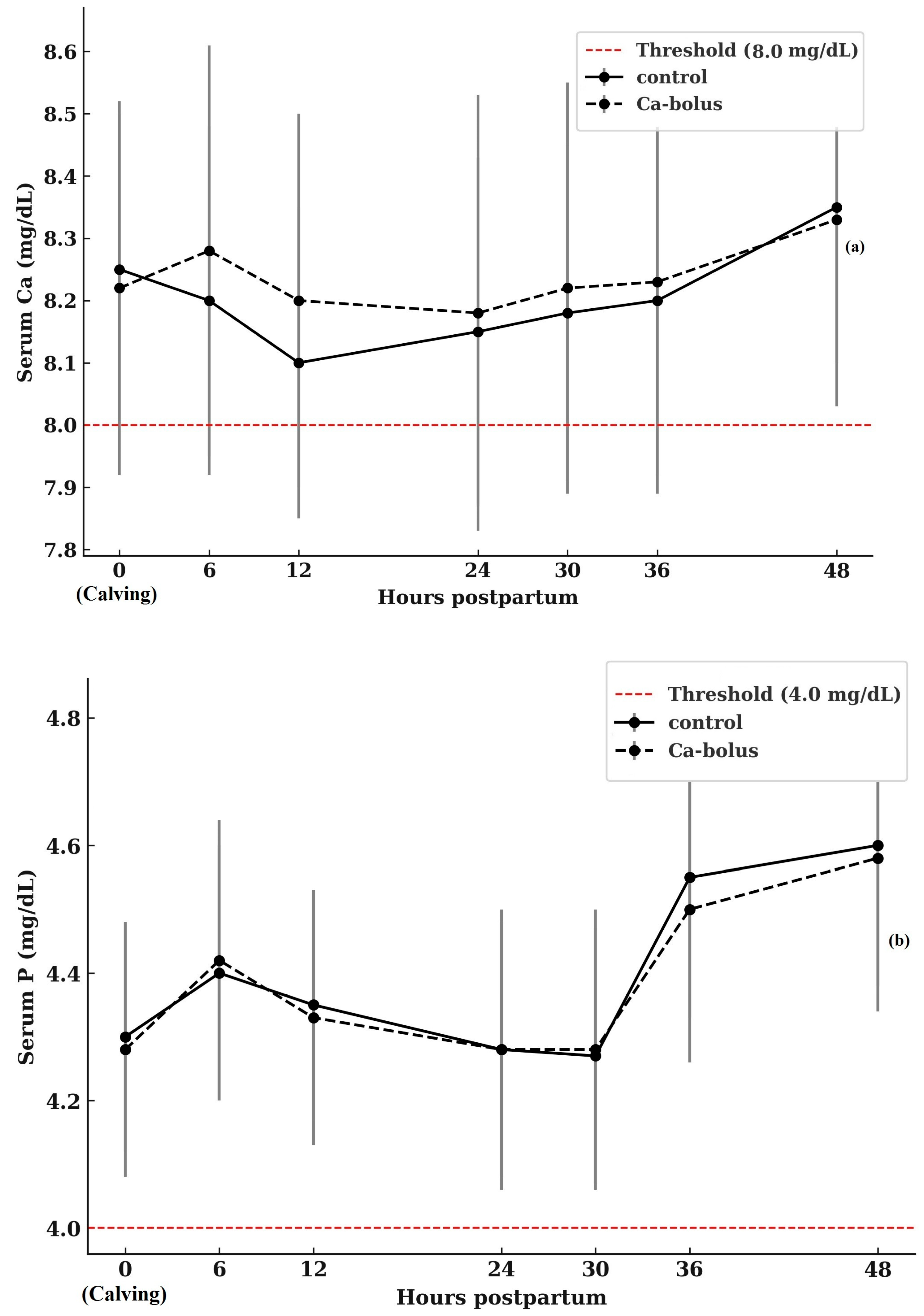 - Frost, I.R.; Seely, C.R.; McCray, H.A.; Callero, K.R.; Seminara, J.A.; Martinez, R.M.; Reid, A.M.; Wilbur, C.N.; Koebel, K.J.; McArt, J.A.A. Effect of postpartum calcium supplementation on serum calcium and parathyroid hormone concentrations in multiparous Holstein cows. JDS Commun. 2024, 5, 215–219. [Google Scholar] [CrossRef]