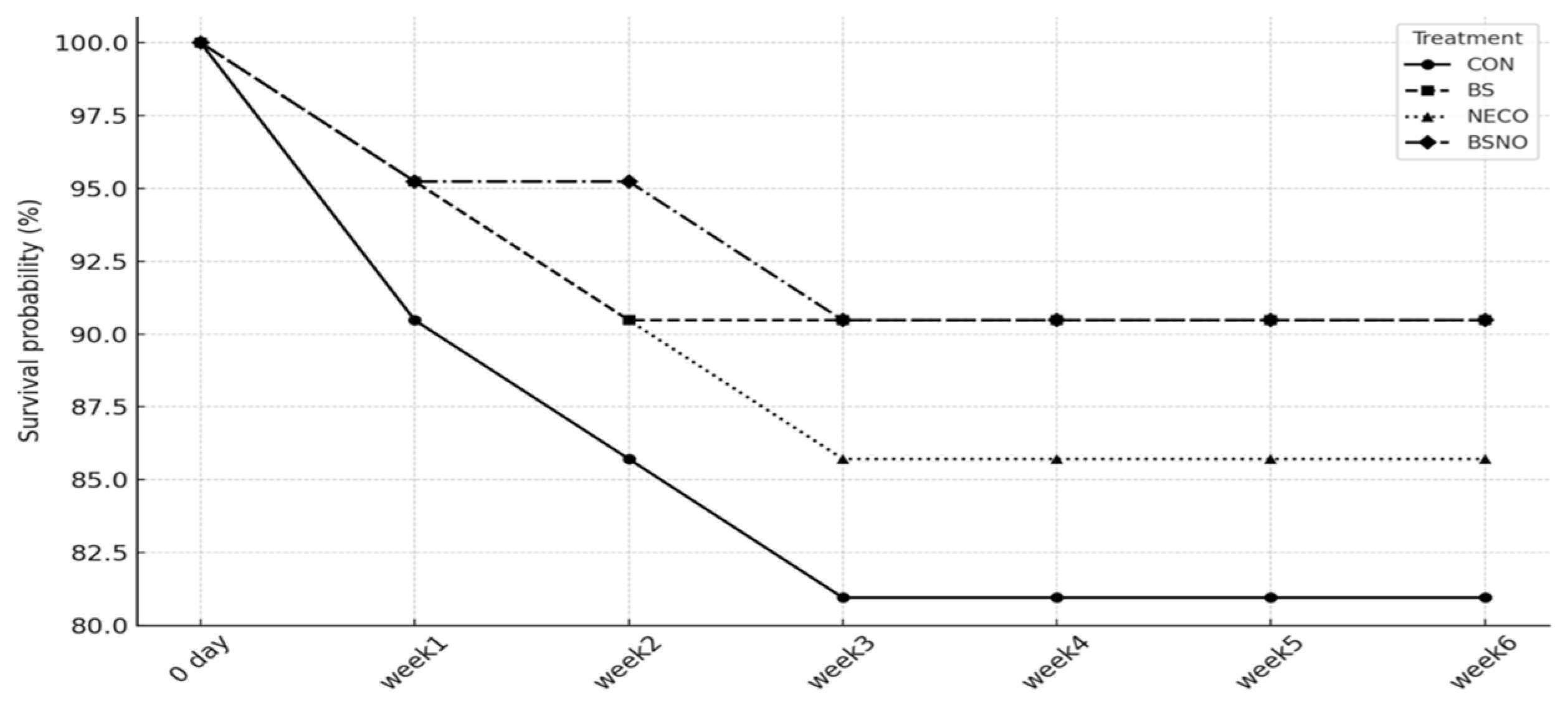 B. subtilis supplementation in enhancing intestinal integrity, oxidative stability, immune response, and intestinal microbial modification is evident, which increases the availability of nutrients and the activity of digestive enzymes. Therefore, the addition of the mixture can play an effective role in enhancing antioxidant defenses, gut health, and nutrient efficiency, supporting the animals’ ability to adapt to heat stress, leading to improved growth performance and significantly reduced mortality rates in growing rabbits exposed to heat stress.
